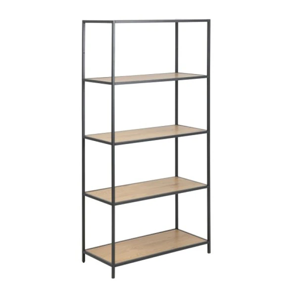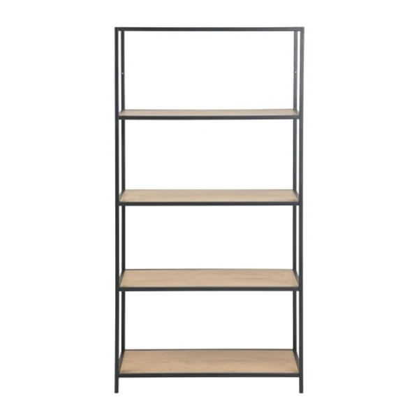 Deze boekenkast met 5 houten planken heeft een ruimtelijk design met strakke, moderne lijnen en een industrieel tintje: dat komt door de mix van hout en metaal. Vul de open vakken met je favoriete boeken en laat af en toe een plekje vrij voor een mooi beeldje of een leuke foto in een lijst. Je kunt de boekenkast met 5 houten planken natuurlijk ook gebruiken voor serviesgoed in de keuken.