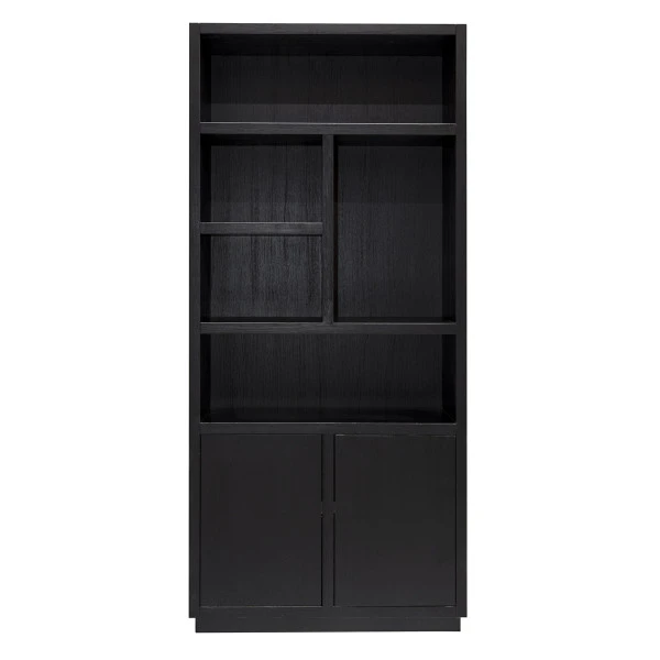 Deze Richmond Interiors Oakura boekenkast heeft een speelse indeling en zorgt zo voor een gezellige sfeer in huis. Zet je favoriete boeken in de 5 open vakken of wissel af met kunst en foto’s. Achter de twee push-to-open deuren is dan nog plaats voor administratie of andere rommeltjes die je liever uit het zicht bewaart. De boekenkast van zwart eiken is verkrijgbaar met het hoge vak links of rechts.