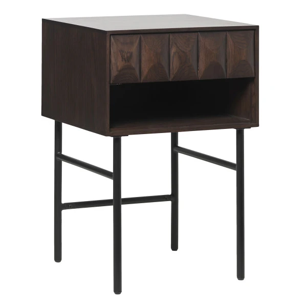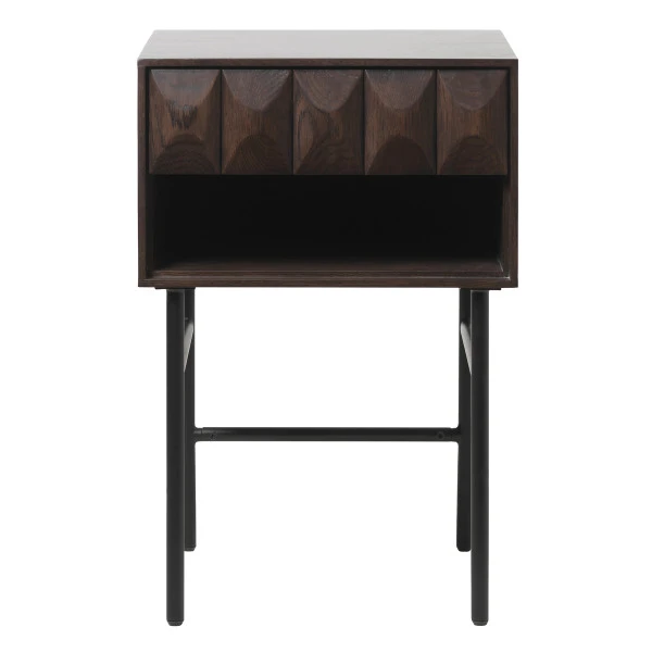 Dit design nachtkastje is een echte sfeermaker. Het donkerbruin eikenfineer zorgt voor een vintage accent en staat gezellig: dat komt niet alleen door de warme espresso kleur, maar ook door het reliëf in de lade. Daarin kun je oordoppen, nachtcrème en een oplader kwijt. Voor je leesboek is plaats in het open vak. Dit design nachtkastje is geschikt voor aan beide kanten van het bed.