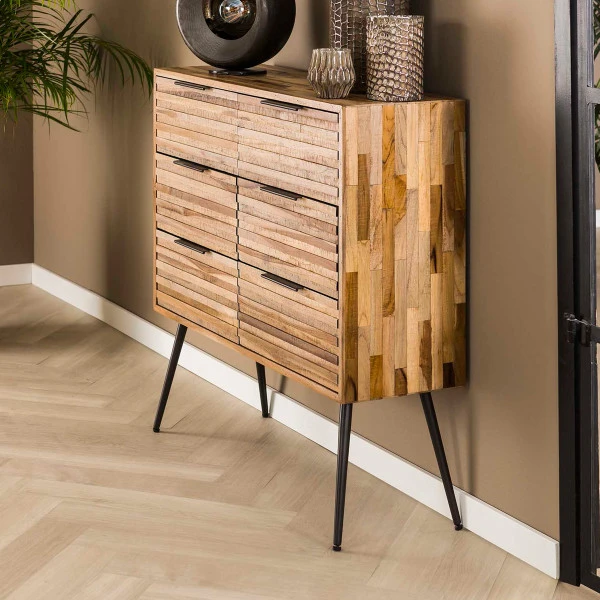 Behalve deze ladekast met 6 lades vind je in de Teca Stripe serie van Giani ook een compact model met 3 lades. Je herkent de meubels uit de serie aan het speelse, eigentijdse design: met stroken ingelegd teakhout en tapse pootjes van metaal. Ook verkrijgbaar als tv-meubel of nachtkastje!