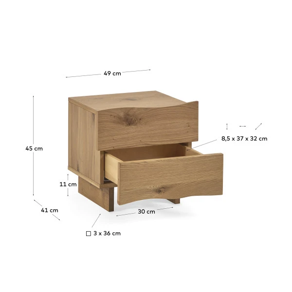 Wat dit Kave Home Rasha nachtkastje zo sfeervol maakt is niet alleen het warme, natuurlijke eiken; maar vooral ook de boomstam vormen in de lades. Alsof het nachtkastje zojuist in elkaar is gezet door de plaatselijke houtbewerker, van de eik uit je tuin! In de twee lades van het nachtkastje kun je bovendien alle boeken, crèmes en opladers wegbergen die anders altijd een rommeltje maken van je slaapomgeving.
