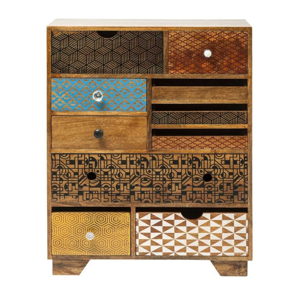 Naar de Kare Design Soleil 10 ladekast blijf je staren; een grote variatie aan kleuren en patronen geeft de houten ladekast een speelse look. Sfeervol retro! Het gelakt mangohout heeft een zonnige tint, waarmee de 10 verschillende ladefronten een gezellig geheel vormen. Voor elk rommeltje heb je voortaan een vaste plek met deze ladekast in de woonkamer.