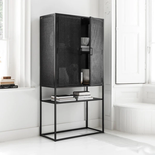 Deze Must Living Spiderman kast staat op hoge poten voor een stijlvol en speels effect. Je witte serviesgoed vormt een gezellig silhouet achter de rotan webbing deuren! Samen met het gerecycled hout zorgt het rotan voor een sfeervol accent. Bovendien combineert het zwart met elke kleur muur, vloer of gordijnen. In het open vak is nog plaats voor een stapel boeken of leuke decoraties.