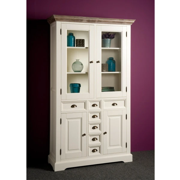 De Tower Living Fleur vitrinekast brengt een romantische, landelijke sfeer naar je eetkamer. Zet je mooiste serviesgoed achter de glazen deuren en berg zilver bestek en schalen op in het onderste gedeelte van de vitrinekast. Of gebruik de landelijke vitrinekast in de woonkamer voor wijnglazen, spelletjes en post! Het vergrijsd houten bovenblad vormt een sfeervol accent in het wit.