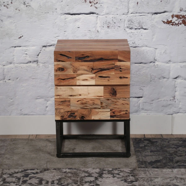 Dit massief acaciahouten nachtkastje is een echte sfeermaker: je slaapkamer wordt er meteen gezellig van. Talloze strookjes acaciahout vormen een kleurrijk, karaktervol en uniek geheel! Dankzij de combinatie van de acaciahouten body met metaal heeft het nachtkastje een modern industriële uitstraling. In de 2 lades is ruim plaats voor je nachtcrèmes, leesboek en telefoon.