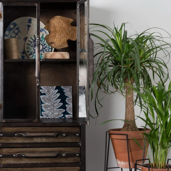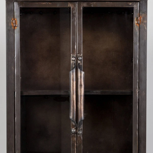 Bijzonder aan de metalen vitrinekast is de roestafwerking van het ijzer; daardoor past de kast mooi in een vintage of industrieel interieur. Met een breedte van 54 centimeter vind je altijd wel een plekje voor de vitrinekast! Leuk in combinatie met een bruin leren bankstel of een houten dressoir.