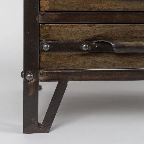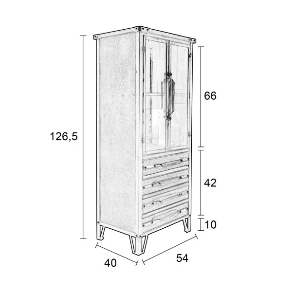 In deze metalen vitrinekast komen je wijnglazen eindelijk tot recht. Of berg je mooiste reissouvenirs van over de hele wereld op achter de glazen deuren, zodat ze stofvrij blijven en je er elke dag van kunt genieten! De metalen vitrinekast beschikt ook nog over vier lades voor losse rommeltjes zoals post, pennen en opladers.