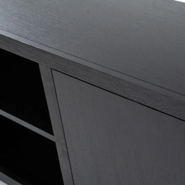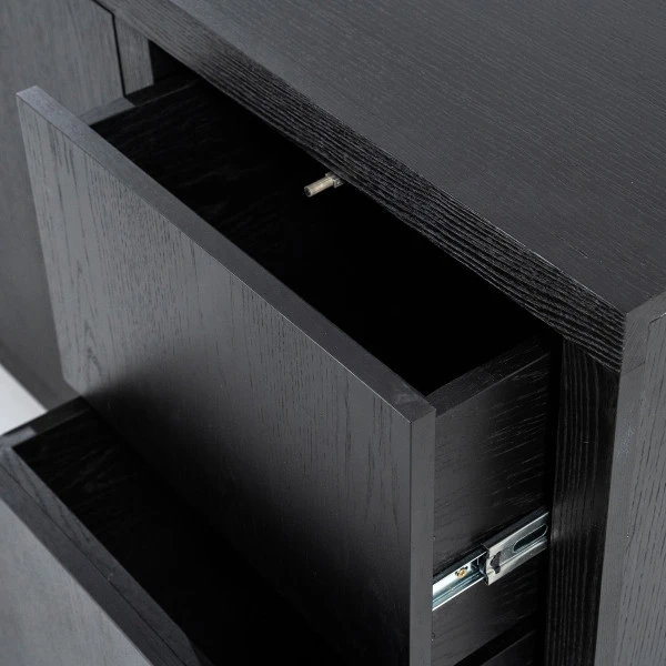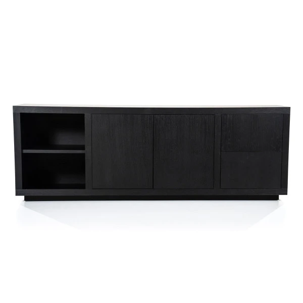 Het Eleonora Helsinki dressoir heeft een modern design, maar de structuur van hout in het zwart gelakt eiken zorgt tegelijkertijd voor karakter. Zet je favoriete boeken in de open vakken en berg spulletjes netjes weg achter de deuren en in de lades. Die werken met een push-to-open systeem dat niet alleen prettig in gebruik is, maar het design ook nog rustiger maakt.