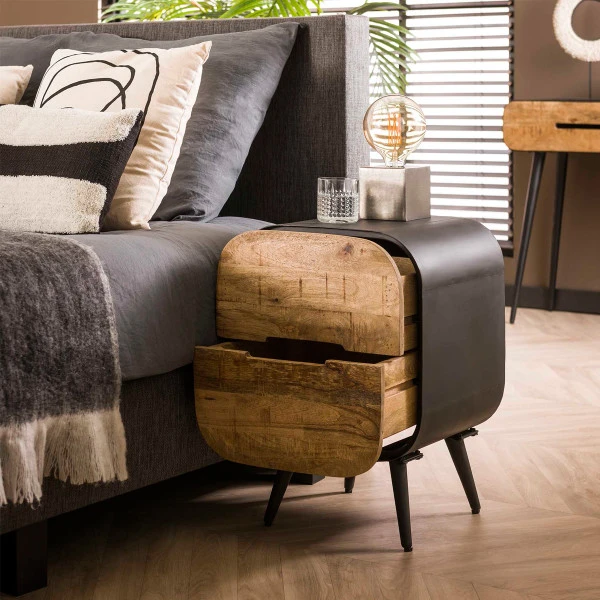 Een speels nachtkastje van metaal met 2 mangohouten lades. De mix van materialen geeft een industriële look, terwijl de ronde vormen voor een retro tintje zorgen. In de 2 sfeervolle, mangohouten lades kun je veel spulletjes kwijt: van boeken en tijdschriften tot opladers en oordopjes. Zo ziet je slaapomgeving er met dit nachtkastje gezellig en rustig uit!