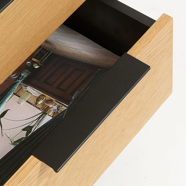 Kenmerkend voor de Kave Home Savoi serie is de mix van naturel en mat zwart gelakt eiken. Details van zwart gelakt metaal zorgen voor een stoer accent. Zet het nachtkastje naast je bed en maak de slaapkamer compleet met een bijpassende ladekast voor je ondergoed en sokken!