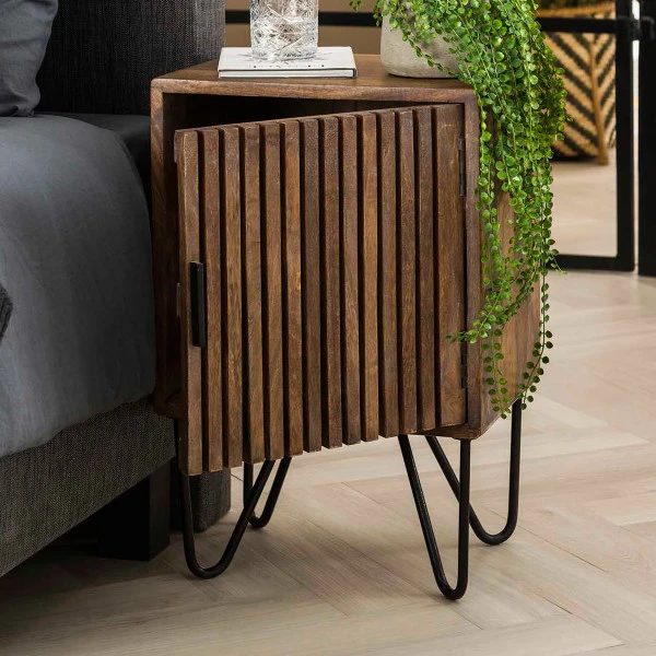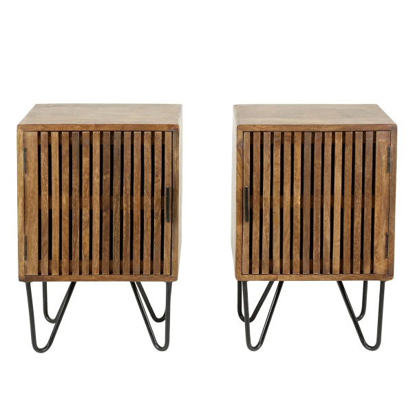 Met deze set van 2 nachtkastjes maak je de slaapkamer in één klap gezellig. Het mangohout zorgt voor zowel sfeer als karakter: je ziet de natuurlijke kleurverschillen er nog mooi in terug. Ribbel deuren en slanke poten van metaal geven de nachtkastjes een design look! Bovendien bieden de nachtkastjes volop opbergruimte voor tijdschriften, boeken en nachtcrèmes.