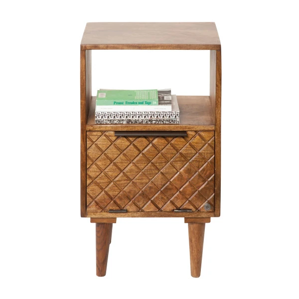 Dit retro nachtkastje van mangohout maakt je slaapkamer extra gezellig! Het hout heeft een warme uitstraling, en een subtiel ruitpatroon in het mangohout zorgt voor een speels effect. De combinatie met de tapse pootjes maakt dat dit nachtkastje perfect in een retro slaapkamer past.