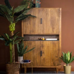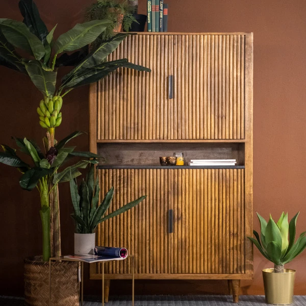De Eleonora Carter wandkast van mangohout maakt je woonruimte in één klap gezellig! Het mangohout is geolied voor een prachtig sfeereffect. Zet een paar groene planten naast je nieuwe wandkast en de retro look is compleet! In de wandkast van 105 bij 172 centimeter is veel ruimte voor boeken, administratie, fotoalbums of juist serviesgoed. Het open vak kun je vullen met enkele mooie decoraties.