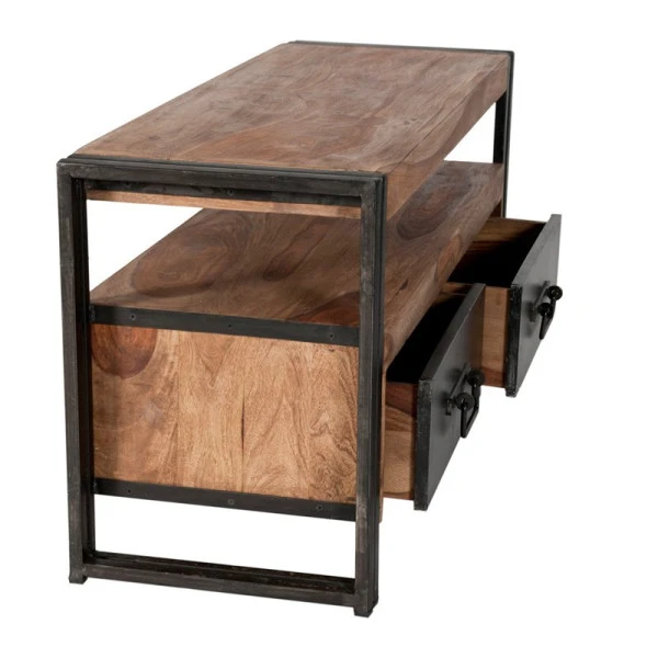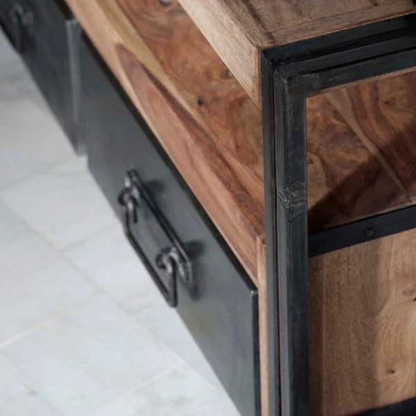 Met dit tv-meubel van sheeshamhout en metaal haal je de perfecte mix van stoer en sfeervol in huis. Elk exemplaar is bovendien uniek: het sheeshamhout is met de hand bewerkt en het metaal gerecycled. Met een breedte van 112 cm past het tv-meubel in de meeste woonkamers. Zet apparatuur in het open vak en berg losse rommeltjes netjes weg in de lades, voor een opgeruimde zithoek!