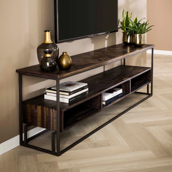 Dit teakhouten tv-meubel maakt je zithoek gezellig en stijlvol. Het bovenste blad is ingelegd met een prachtig Versailles houtpatroon, maar ook het houten vak eronder brengt veel sfeer. Daar kun je apparatuur in zetten, of leg er stapels met boeken in. Voor decoraties is dan nog ruim plaats op de planken. Met een breedte van 160 centimeter past er een flink beeldscherm op of boven het tv-meubel.