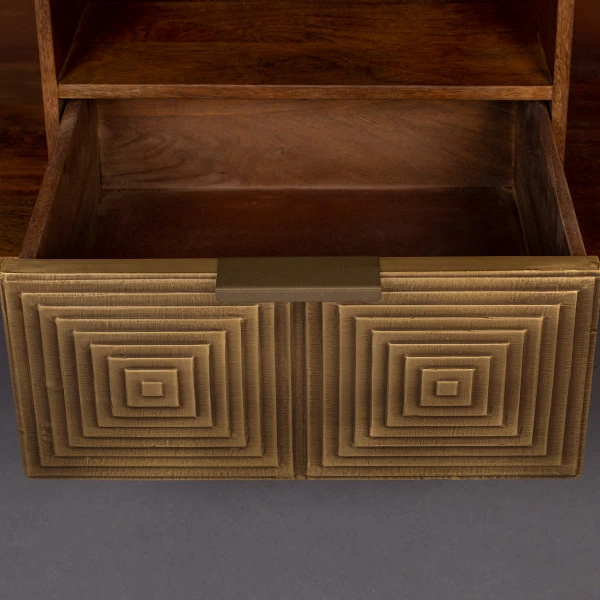 - Goudkleurige ‘antique brass’ afwerking op de deuren en lade