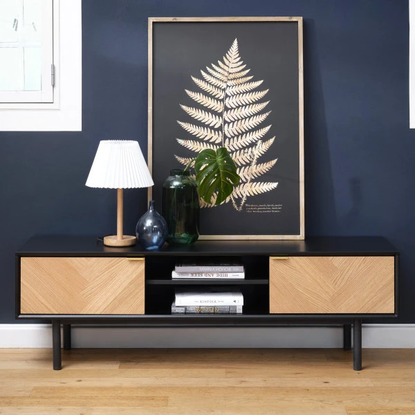 Dit tv-meubel met vissengraatpatroon in de deuren maakt je zithoek stijlvol en gezellig. In het open vak is plaats voor apparatuur; kabels werk je netjes weg via de kabelopening. Achter de eiken deuren met vissengraatpatroon kun je de rommeltjes wegbergen die anders je woonkamer zo ongezellig maken. Of zet er wijnglazen, boeken en spelletjes in!