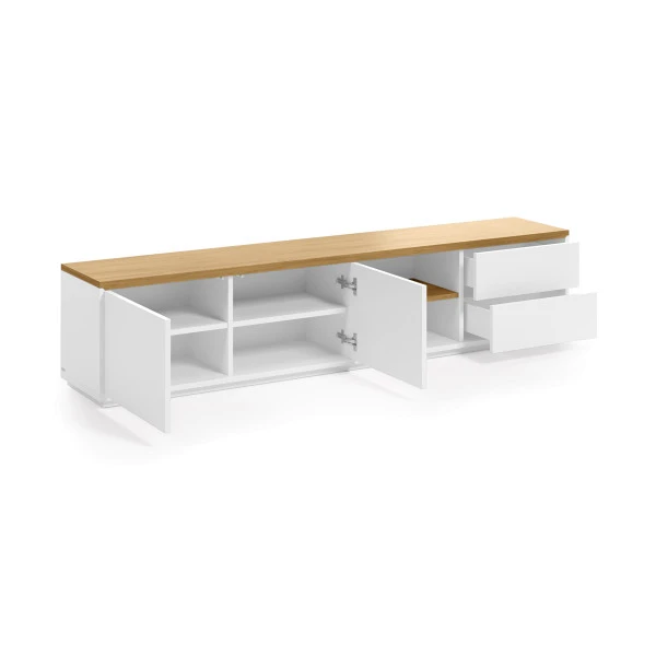 In dit Kave Home Abilen tv-meubel van 200 cm breed kun je alle rommeltjes kwijt die anders altijd je zithoek zo ongezellig maakten! Berg er wijnglazen in op en het speelgoed van de kinderen; televisieapparatuur natuurlijk, en stapels vol tijdschriften. Zo brengt het tv-meubel veel rust naar je zithoek. Ook vanwege het strakke design met lichte kleuren: gelakt wit en naturel eiken.