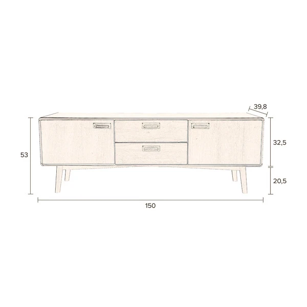 In dit Dutchbone Juju tv-meubel van 150 centimeter breed is veel plaats voor je apparatuur én de losse rommeltjes die anders altijd de woonkamer zo ongezellig maken. Wil je een sfeervol, harmonieus geheel creëren in je interieur? Dan kun je het tv-meubel combineren met het bruin houten dressoir uit dezelfde Juju serie!