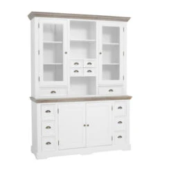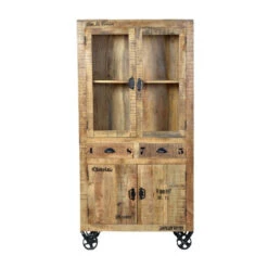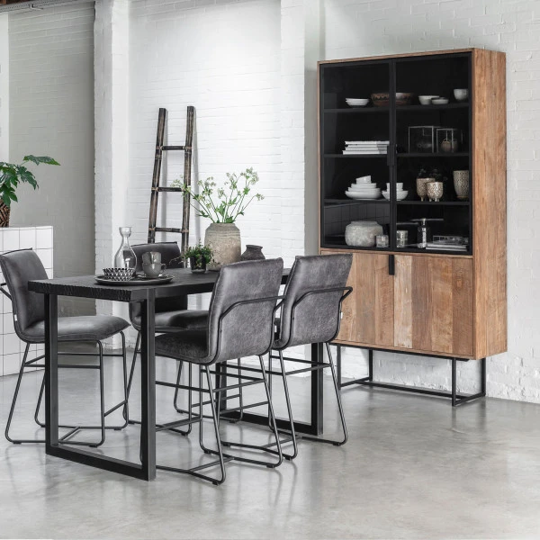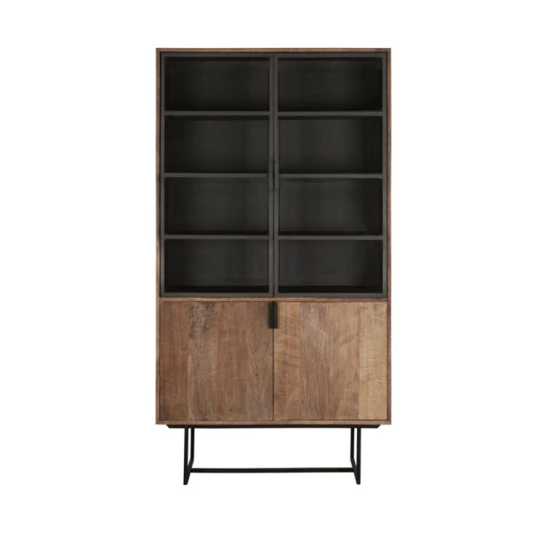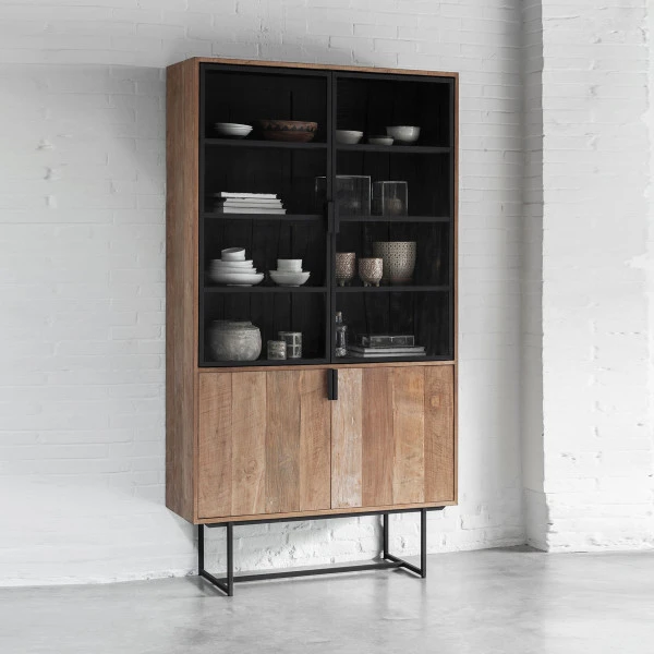 - 2 deuren van zwart metaal en glas, 2 deuren van teakhout met daarachter een legplank