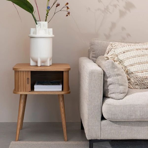 Een gezellige Zuiver Barbier bijzettafel voor naast de bank. De speelse poten en de groeven in het essen deurtje geven de bijzettafel een retro look. Zet een mooie vaas bovenop en gebruik de opbergruimte voor boeken, tijdschriften of onderzetters en afstandsbedieningen! Behalve als bijzettafel ook leuk als nachtkastje in de slaapkamer.