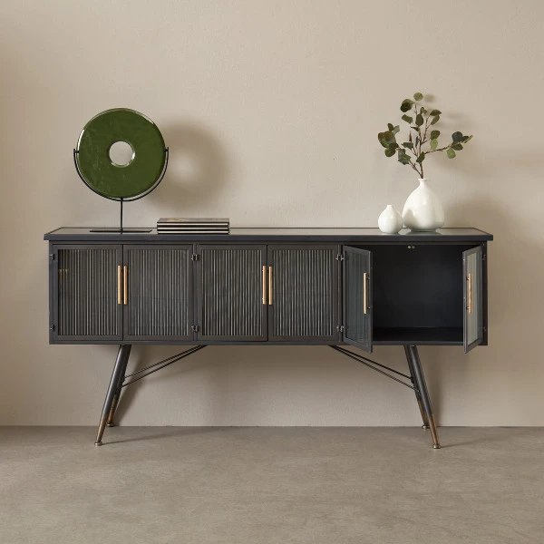 Bijzonder aan het Kare Design Gomera dressoir is de mix van stijlvolle en speelse elementen. De schuine poten geven het dressoir van zwart gepoedercoat staal een eigenzinnige look; de messing voetjes en handgrepen zorgen juist voor een stukje klasse. Berg serviesgoed op achter de deuren van geribbeld glas of gebruik het dressoir voor boeken, fotoalbums en speelgoed.