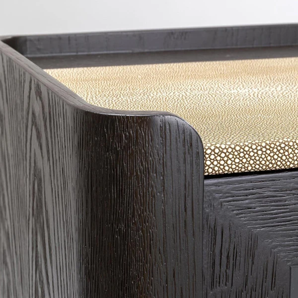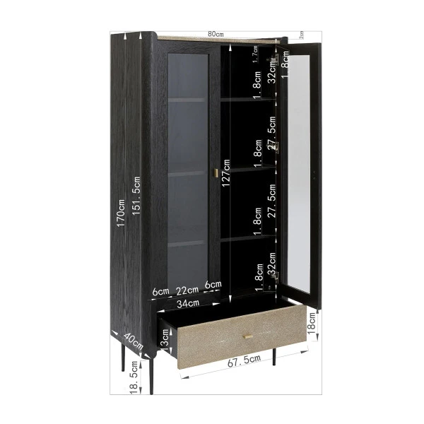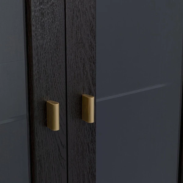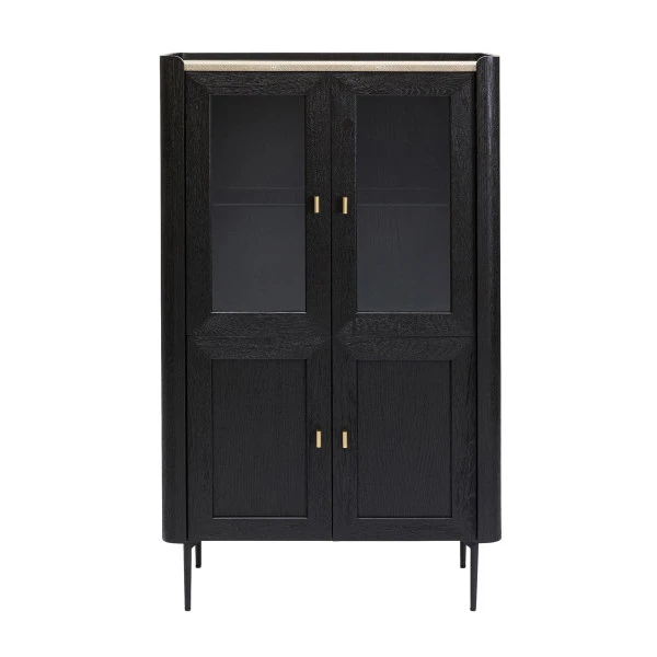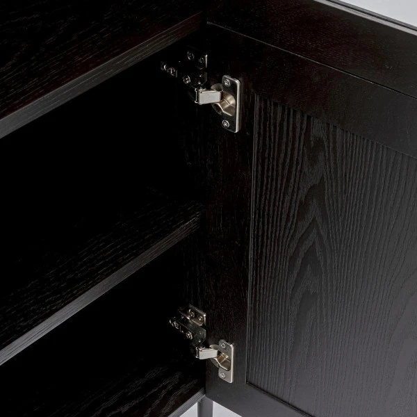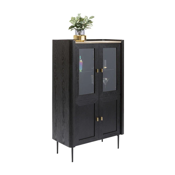 Opvallend aan de Kare Design Milano serie is de mix van materialen. Het zwarte eikenfineer vormt de basis; aangevuld met details van textiel, metaal en geborsteld staal. Behalve deze lage buffetkast vind je in de serie ook zwarte vitrinekast en een design dressoir!